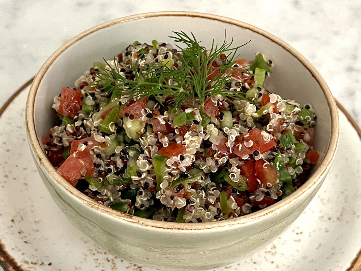This salad would work great as a starter or served with crackers. Packed with omega-3 rich salmon and crab, this vibrant salad supports digestive health while offering a burst of flavor and color to impress your guests.